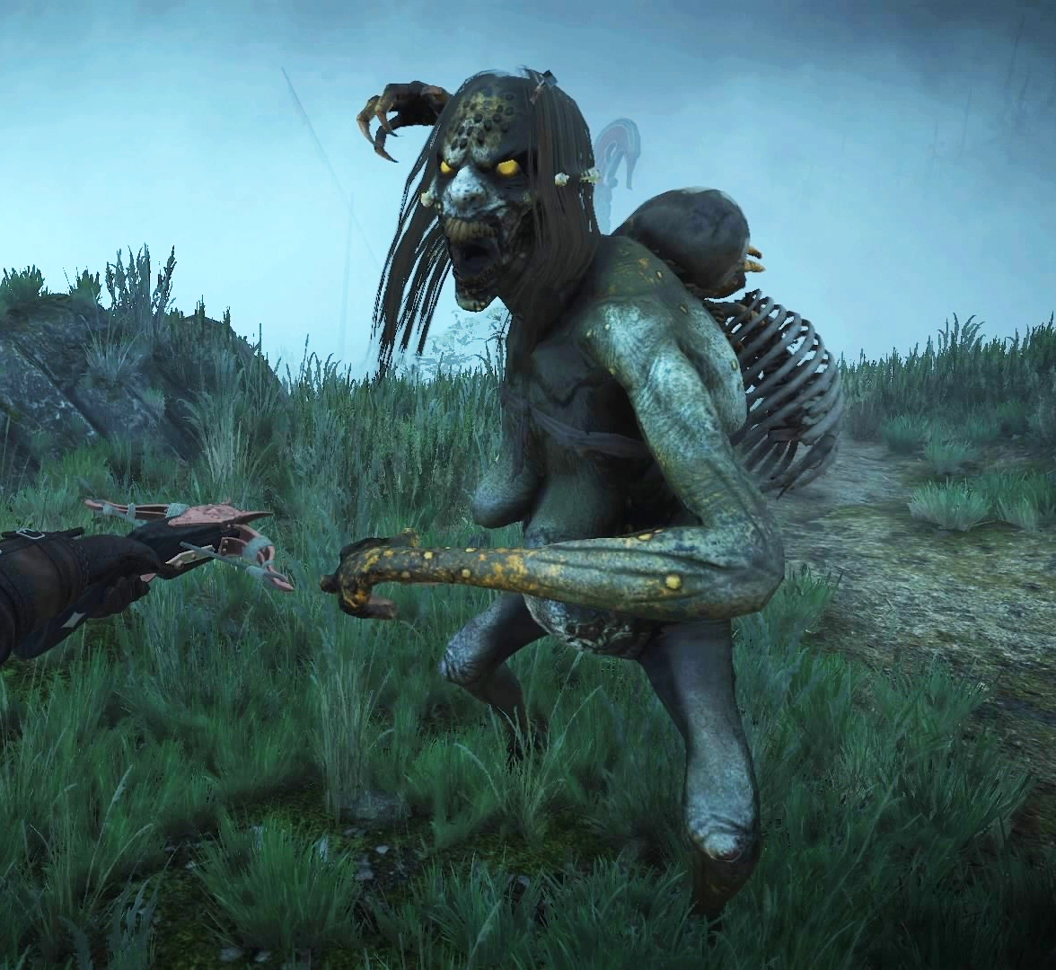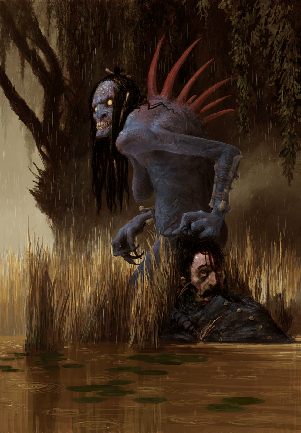 - Некоторые предания говорят о том, как водные бабы и водницы заманивали путников в свои построенные на болотах хатки, притворяясь заблудившимися старушками. На самом деле только очень пьяный или слепой мог бы перепутать смердящее тиной и падалью логово с уютным домиком, а само чудовище — с бабушкой. Сморщенное и покрытое бородавками тело водной бабы достигает почти сажени и воняет илом и рыбой. Из загривка у нее торчат длинные, до двух падей длиной, костяные отростки. Образ дополняют волосы, похожие на ворох спутанных водорослей, и когти, которых не постыдился бы волколак.