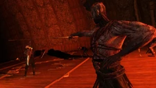 После увиденного «монстробой» обнажает свой меч и уже медленней подходит к неизвестному существу, игнорирующего слова ведьмака. Оказавшись чуть ближе, охотник видит изуродованное тело того самого Каймира. Громадина, что до этого копала, снимает с себя капюшон, обнажая лик, что выглядит как кусок лоскута, пришитый вместо лица, и атакует. Это оказывается крайне тяжелый бой ― против такого рода чудовища сражаться ведьмаку приходится не каждый день. Несмотря на свои габариты, монстр быстр и ловок, а также с легкостью орудует своей лопатой. Но этого оказывается недостаточно, чтобы одолеть опытного фехтовальщика. Когда существо падает замертво, Геральт бегло осматривает его: ни глаз, ни ноздрей, органы деформированы — оно никак не могло быть живым.