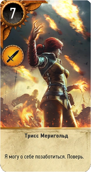 | 7 | Трисс Меригольд | Герой | Выигрывается у Ламберта в ходе квеста «Гвинт: Старые товарищи», либо у Эскеля в ходе квеста «В гостях хорошо, а дома лучше», или же находится в Каэр Морхене внутри замка на первом этаже на одной из коек. | |