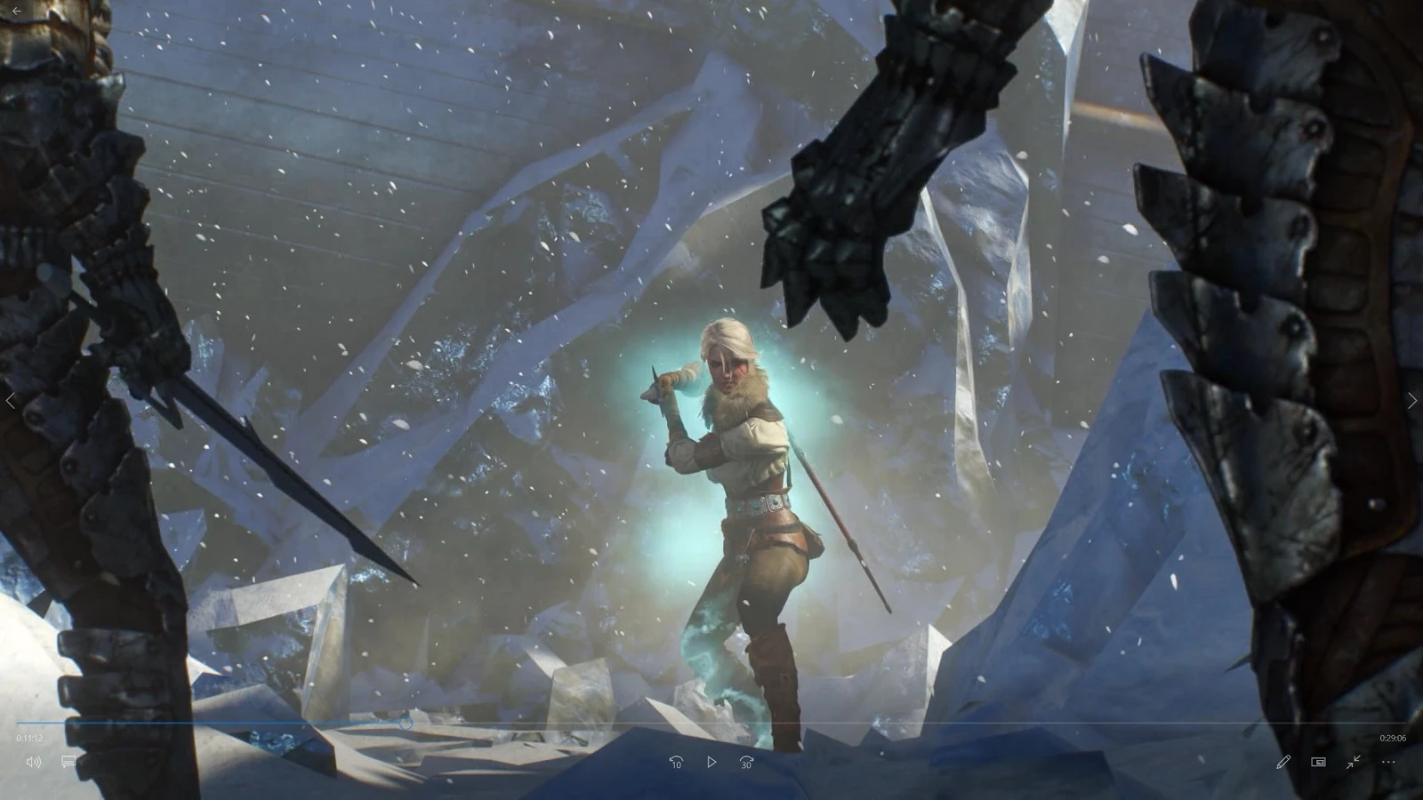 На корабле Геральта окружают гончие, но в последний момент его спасает Йеннифэр, утягивая в портал. Геральт интересуется у чародейки, где Цири, однако она не в курсе. Йеннифэр была уверена, что девушка с ведьмаком. Внезапный взрыв заставляет Геральта и Йен обратить внимание на башню Tor Gvalch'ca — Башню Соколицы. Врата между мирамиоткрылись, и надвигается Белый Хлад.