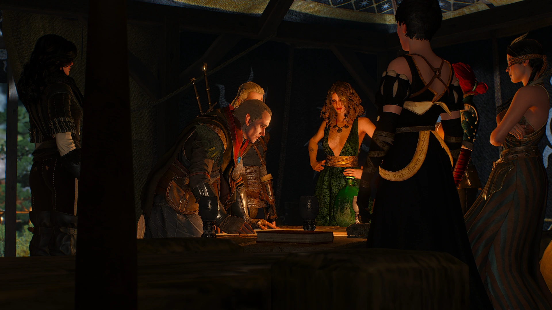 В зависимости от того, с кем продолжил отношения Геральт, в диалогах с Йеннифэр и Трисс будут присутствовать разные варианты. Диалог может и не произойти вовсе в случае ранее произошедшего неудачного отдыха.