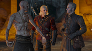Во-первых, Геральт предлагает оказать Скрытому услугу, но тот, насмехаясь, отвечает, что у ведьмака нет ничего, что бы он мог дать древнему вампиру; во-вторых, Геральт может сказать, что гибнут невинные люди, но Скрытый отвечает, что они в любом случае умрут — раньше или позже, ― а потому разницы он не видит; в-третьих, Геральт может сказать, что выходки Детлаффа ― как Хагмара когда-то ― спровоцируют масштабную охоту на вампиров, и люди однажды доберутся до пещеры Скрытого, сначала нарушив его покой, а затем обрушат свод в пещере или затопят, уничтожив таким образом врата. Древний вампир внимает последней причине, возвращает Региса к жизни и спрашивает, что они собираются делать с Детлаффом. Геральт может ответить, что они убьют его или договорятся, но в любом случае Скрытый напоминает Регису, что если тот «выпьет» своего собрата, то будет проклят, а затем соглашается призвать Детлаффа в Тесхам Мутна, когда придёт нужное время, после чего снова возвращается к ожиданию у дверей, прогоняя гостей прочь.