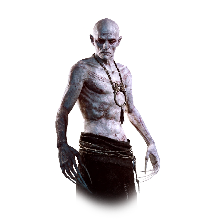 - Другая альтернативная внешность Скрытого, входящая в дополнение Алое проклятие, изображает его в доспехах из Хен Гайдт, вооружённого мечом и копьём и явно моложе, чем при встрече с Геральтом, — на его затылке всё ещё растут длинные седые волосы, полностью выпавшие к 1275 году, при этом его уши остры, как у эльфов. Тем не менее не вполне понятно, зачем практически всемогущему и неуязвимому вампиру оружие и доспехи ― возможно, они имеют ритуальные цели или Скрытому просто удобнее использовать в бою, особенно с другими вампирами, меч, а не собственные когти.