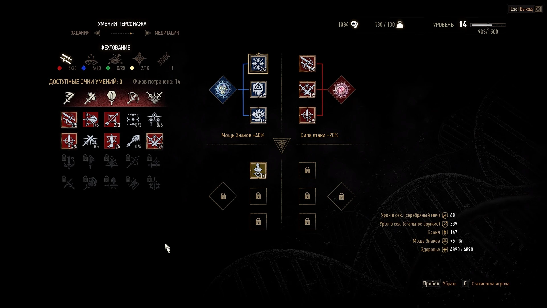Это ваше базовое умение. Оно всегда активно. Позволяет варить и пить ведьмачьи зелья | 0 |