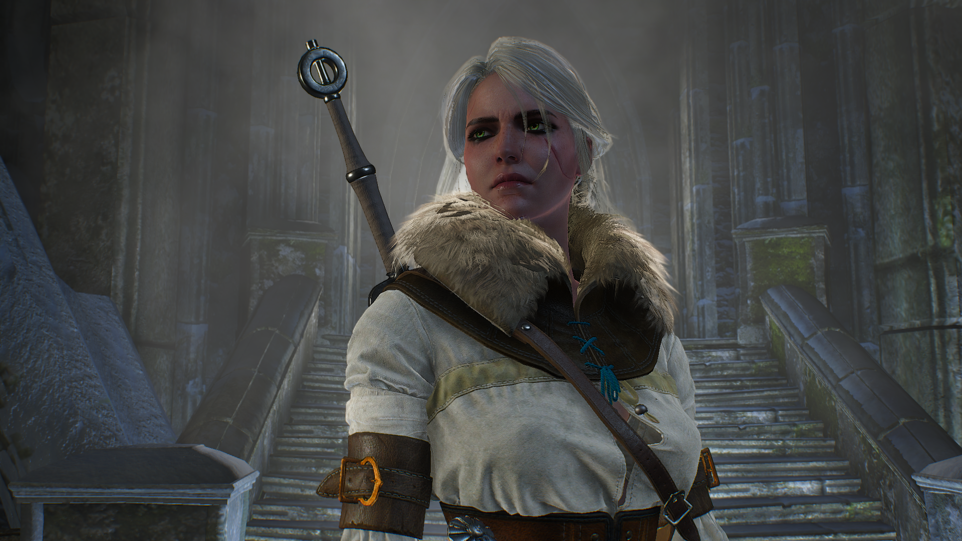 Далее ведьмачка вспоминает, как Весемир носил её в детстве на закорках, но подмечает, что этого не делал Геральт, и запрыгивает своему учителю на спину. Ведьмак катает девушку на себе, и она, счастливо и громко смеясь, падает с ним на снег. Потом Цири поднимается и просит вернуться в корчму, вспоминая по дороге, как страдала на тренировках с Маятником, ходя в синяках, и как боялась не справиться, а Геральт запретил ей сдаваться. Когда появляется нильфгаардский эскорт, Цири понимает, что пришла пора прощаться, и начинает плакать. Девушка сообщает о своём решении, что ей нельзя больше убегать, и если она хочет что-нибудь изменить, то это нужно делать из сердца империи, а не гоняясь за чудовищами по заброшенным деревням. На прощание она дарит Геральту свой меч и крепко обнимает ведьмака, уезжая с нильфгаардским эскортом во главе с генералом Воорхисом в Нильфгаард.