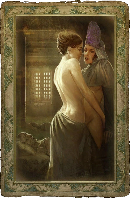 Принеся лекарство для Трисс, стоит согласиться составить ей компанию, а затем выбирать в вариантах ответов «тебя не за что прощать». Таким образом Геральт получит свою первую коллекционную эротическую карточку.